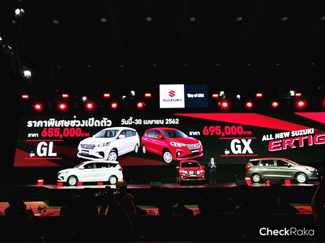 สัมผัส "Unlock Your Life...ปลดล็อกอีกด้านของชีวิต" All New Suzuki ERTIGA มีให้เลือกทั้งหมด 4 สี Radian Red, Magma Grey, Pearl White Snow และ Prime Cool Black โดยมี 2 รุ่น คือ GL (AT) และ GX (AT) และแคมเปญพิเศษส่วนลดอุปกรณ์ตกแต่งมูลค่าสูงสุด 10,000 บาท พร้อมฟรีประกันภัยชั้นหนึ่ง เป็นระยะเวลา 1 ปี และบริการช่วยเหลือฉุกเฉินจากบริษัท เอ ดับเบิลยู พี (ประเทศไทย) จำกัด ระยะเวลา 3 ปี ทั้งนี้เงื่อนไขเป็นไปตามที่บริษัทฯ กำหนด