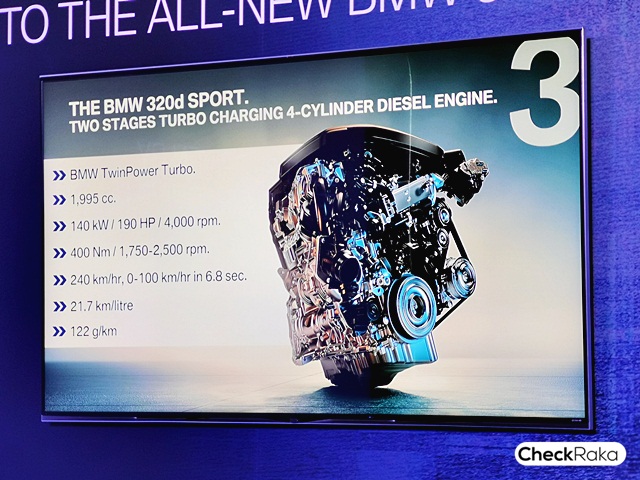 เริ่มที่บีเอ็มดับเบิลยู 320d Sport ใหม่ มาพร้อมชุดแต่ง BMW Individual high-gloss Shadow Line ด้วยขอบหน้าต่าง ขอบช่องดักอากาศ และบริเวณกระจังหน้าไตคู่สีดำเงา ทรงพลังด้วยเครื่องยนต์ดีเซล 4 สูบ กำลังสูงสุด 140 กิโลวัตต์ / 190 แรงม้าที่ 4,000 รอบต่อนาที และแรงบิดสูงสุด 400 นิวตันเมตรที่ 1,750 - 2,500 รอบต่อนาที อัตราเร่งจาก 0-100 กิโลเมตรต่อชั่วโมงได้ภายใน 6.8 วินาที และมีความเร็วสูงสุด 240 กิโลเมตรต่อชั่วโมง และมี Driving Experience Control ที่มีรูปแบบการขับขี่ให้เลือกทั้งในโหมด COMFORT, SPORT และ ECO PRO ล้อแม็ก 18 นิ้วลาย V Spoke