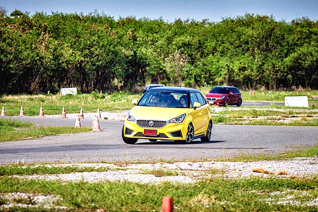 ในขณะที่กิจกรรมช่วงบ่าย จะเน้นการฝึกปฏิบัติบนสนามทดสอบจำลองการขับขี่ อาทิ ฝึกหมุนพวงมาลัย การขับรถในทางโค้ง ทั้งในสภาวะปกติและการแก้ไขปัญหาเฉพาะหน้าในภาวะฉุกเฉิน พร้อมสัมผัสประสบการณ์การขับขี่แบบสนามแข่งขันกับทีมฝึกสอนของเอ็มจี ซึ่งทำให้เห็นถึงความเชี่ยวชาญของทีมฝึกสอน (Instructor) และสมรรถนะของรถยนต์เอ็มจี ได้เป็นอย่างดี
