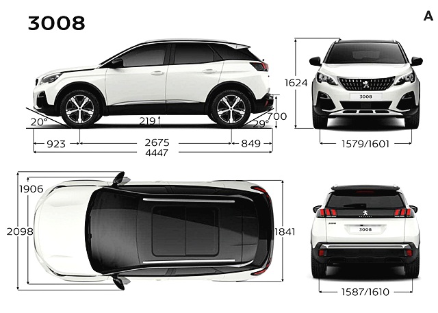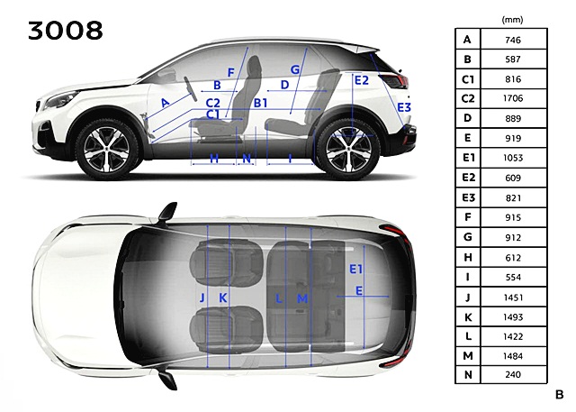Peugeot 3008 รถยนต์อเนกประสงค์ 5 ที่นั่งในคอนเซ็ปต์ "ไฮ-เอ็นด์ เมนสตรีม" โดดเด่นด้วยไฟหน้า Full LED ไฟท้าย LED ตัวรถสีทู-โทน มีมิติตัวรถยาว 4,447 มม. กว้าง 2,098 มม. สูง 1,624 มม. ความสูงใต้ท้อง 219 มม. ระยะฐานล้อ 2,675 มม. ล้อแม็กมีตั้งแต่ล้อ 17 ไปจนถึง 19 นิ้ว และมาพร้อมระบบประตูท้ายไฟฟ้าแบบ Hand Free เพียงใช้เท้ากวาด