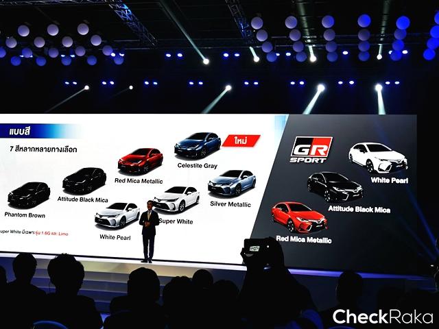 โคโรลล่า อัลติส ใหม่ 6 รุ่น มีให้เลือกทั้งหมด 7 สี ได้แก่ White Pearl, Phantom Brown, Super White II, Attitude Black Mica, Silver Metallic, Red Mica Metallic และสีใหม่ Celestite Gray