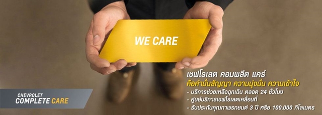 เชฟโรเลต คอมพลีต แคร์ คือคำสัญญาจากเรา ในการมอบประสบการณ์ที่ดีที่สุด เพื่อความปลอดภัยของคุณเมื่ออยู่บนท้องถนน บริการของคอมพลีต แคร์ ครอบคลุมการรับประกันคุณภาพรถยนต์ตลอด 3 ปี หรือ 100,000 กิโลเมตร (อย่างใดอย่างหนึ่งถึงก่อน) บริการตรวจเช็คระยะ ศูนย์บริการเชฟโรเลตเคลื่อนที่ (Mobile Service) บริการช่วยเหลือฉุกเฉินตลอด 24 ชั่วโมง (Roadside Assistance) และ ศูนย์ลูกค้าสัมพันธ์เชฟโรเลต 1734 ที่พร้อมดูแลไม่ว่าคุณอยู่ที่ไหน