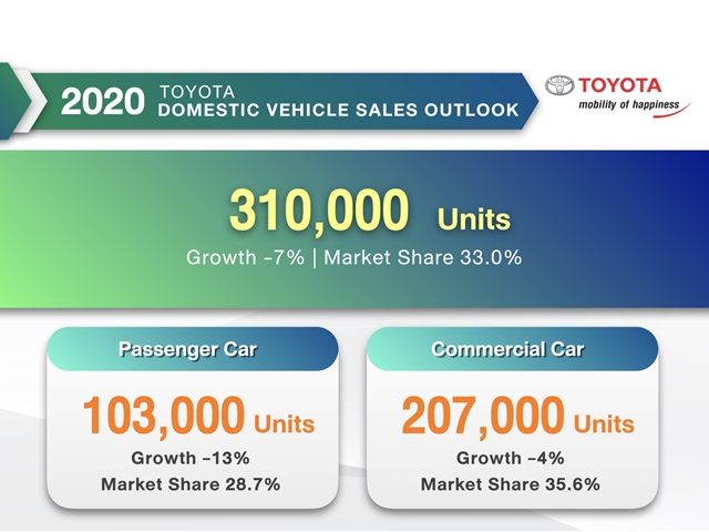 สำหรับเป้าหมายของโตโยต้าในปี 2563 โตโยต้ามีเป้าหมายการขายที่ 310,000 คัน ด้วยส่วนแบ่งการตลาดที่ 33.0% ลดลงประมาณ 7% เมื่อเทียบกับปีที่ผ่านมา และเพื่อบรรลุเป้าหมายนี้เราจะเสริมสร้างความแข็งแกร่งด้วยการเพิ่มความหลากหลายของผลิตภัณฑ์ เพื่อตอบสนองความต้องการของลูกค้าให้ดียิ่งขึ้น พร้อมยกระดับประสบการณ์การเป็นเจ้าของรถยนต์โตโยต้าด้วยการดูแลเอาใจใส่ลูกค้านับตั้งแต่วันแรกที่ซื้อรถยนต์ ตลอดจนวันสุดท้ายของการใช้งาน