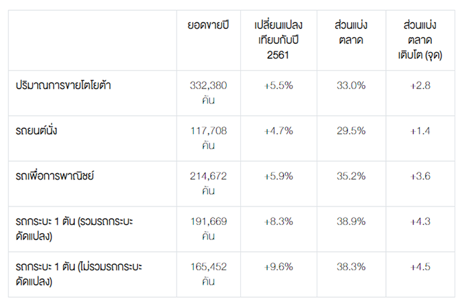 สำหรับยอดขายโตโยต้าในปี 2562 สามารถสร้างยอดขายเพิ่มขึ้นสวนทางกับสถานการณ์ตลาดที่หดตัวลง โดยโตโยต้ามียอดขายอยู่ที่ 332,380 คัน เพิ่มขึ้นประมาณ 6% ครองส่วนแบ่งการตลาด 33.0% เพิ่มขึ้นจากปีที่แล้ว 2.8 จุด โดยปัจจัยหลักมาจากการตอบรับที่ดีของลูกค้าและจากการเปิดตัวรถยนต์รุ่นใหม่และรุ่นปรับปรุงใหม่ของรถยนต์นั่งอย่าง New Camry และ New Corolla Altis รวมไปถึงกิจกรรมส่งเสริมการขายของ Yaris และ ATIV ตลอดจนรถเพื่อการพาณิชย์ อย่าง Hilux Revo Z Edition, Commuter และ Majesty