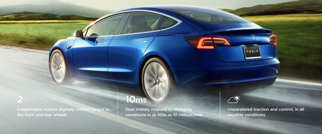 TESLA MODEL 3 มาพร้อมมอเตอร์ไฟฟ้า 2 ชุดควบส่งกำลังล้อคู่หน้าและหลังแบบ AWD ให้อัตราเร่งจาก 0 - 96 กิโลเมตร/ชั่วโมง ในเวลาเพียง 3.2 วินาทีเท่านั้น และทำความเร็วสูงสุด 162 ไมล์/ชั่วโมงหรือราว ๆ 260 กิโลเมตร/ชั่วโมง และวิ่งได้ระยะทาง 322 ไมล์หรือ 518 กิโลเมตร นอกจากนี้หากใช้ระบบซูเปอร์ชาร์จ ชาร์จไฟฟ้าเพียง 15 นาที สามารถวิ่งต่อไปได้อีก 172 ไมล์ หรือ 276 กิโลเมตร และถ้าในเส้นทางที่มีจุดชาร์จเร็ว (ซูเปอร์ชาร์จ) จะสามารถวิ่งไปมากถึง 14,000 กว่ากิโลเมตรเลยทีเดียว
