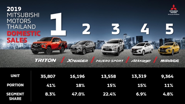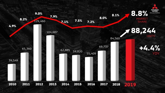 บริษัท มิตซูบิชิ มอเตอร์ส (ประเทศไทย) จำกัด ประกาศยอดจำหน่ายรถยนต์ในปี 2562 เติบโตเพิ่มขึ้น 4.4% เมื่อเทียบกับปีก่อนหน้า เป็นยอดจำหน่ายรวม 88,244 คัน มีส่วนแบ่งตลาด 8.8% ผลการดำเนินงานของ มิตซูบิชิ มอเตอร์ส ประเทศไทย เติบโตสูงกว่าอุตสาหกรรมรถยนต์ในภาพรวมที่มียอดจำหน่ายรวมทั้งหมด 1,007,552 คัน ลดลง 3.3% จากปี 2561