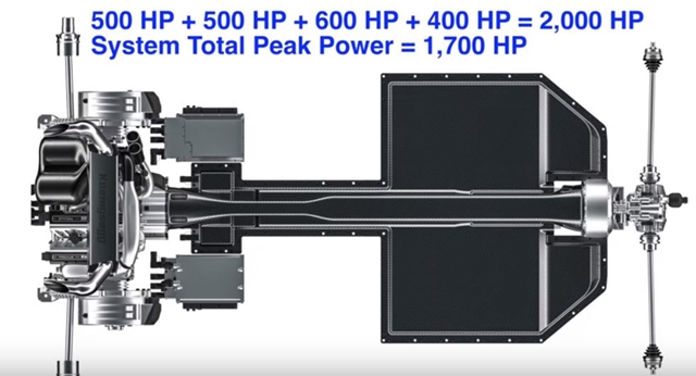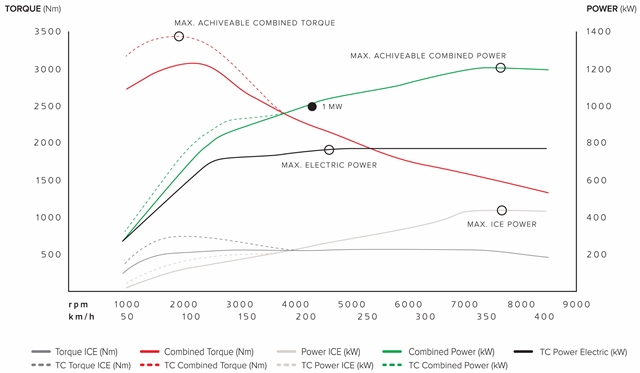ขุมพลังสุดยอดเทคโนโลยี Freevalve engine ผสาน new plug-in hybrid จากเครื่องยนต์เบนซินฟรีวาล์วหรือระบบควบคุมวาล์วด้วยไฮดรอลิกส์และนิวเมตริก (ลม) เพื่อควบคุมการทำงานเปิด-ปิด วาล์วได้ตามความต้องการของรอบเครื่องยนต์ทั้งสูงหรือต่ำ ได้ตามต้องการ ทำให้เครื่องยนต์เล็ก ๆ แค่ 3 สูบ 2.0 ลิตร พ่วงเทอร์โบ 2 ชุดเข้าไปนี้ สามารถสร้างกำลังสูงสุดได้มากถึง 600 แรงม้า แรงบิด 600 นิวตัน-เมตร และยังผสานการทำงานขับเคลื่อนระบบมอเตอร์ไฟฟ้าอีก 3 ชุด คือ มอเตอร์ไฟฟ้า 2 ล้อหลังกำลัง 500 แรงม้า แรงบิด 1,000 นิวตัน-เมตรต่อที่ชุด และมอเตอร์ไฟฟ้ากำลัง 400 แรงม้า แรงบิด 900 นิวตัน-เมตร ชุดส่งกำลังไปสู่ล้อหน้าอีก 1 ชุด ทำให้มีกำลังรวมสูงสุด 1,700 แรงม้า แรงบิดรวม 3,500 นิวตัน-เมตร และส่งผลให้ซูเปอร์คาร์คันี้พุ่งทยานตัวอัตราเร่ง 0 - 62 ไมล/ชม. ในเวลา 1.9 วินาที ซึ่งในอนาคตจะทดสอบอัตราเร่ง 0 - 400 กม./ชม. มาให้ชมกัน