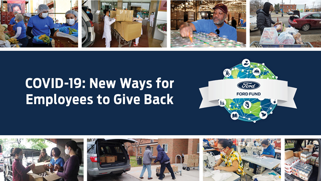 กองทุน ฟอร์ด มอเตอร์ คัมปะนี (Ford Motor Company Fund) หน่วยงานเพื่อสังคมของฟอร์ด เปิดตัวสองกิจกรรมเพื่อสังคมเพื่อให้พนักงานทั่วโลก และผู้ที่สนใจมีส่วนร่วมในกิจกรรมเพื่อสังคมแม้อยู่ที่บ้าน การระดมทุนร่วมกับพนักงานในช่วงสถานการณ์การแพร่ระบาดของ COVID-19 เป็นความร่วมมือระหว่าง กองทุน ฟอร์ด มอเตอร์ คัมปะนี และการบริจาคทุนส่วนตัวของมร. บิล ฟอร์ด ประธานกรรมการบริหาร ฟอร์ด มอเตอร์ คัมปะนี เพื่อนำเงินบริจาคราว 16.5 ล้านบาท สมทบกับเงินบริจาคที่ได้รับตามจริงจากพนักงานฟอร์ดทั่วโลกและผู้ที่สนใจ รวมมูลค่าราว 33 ล้านบาท มอบให้องค์กรไม่แสวงหาผลกำไรที่ได้รับการคัดเลือกจากกว่า 20 ประเทศทั่วโลก ร่วมรับมือสถานการณ์การแพร่ระบาดของ COVID-19 โดยเริ่มระดมทุนตั้งแต่วันที่ 2 เมษายน ถึง 31 พฤษภาคม 2563