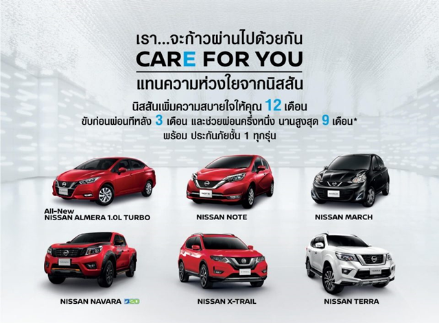 บริษัท นิสสัน มอเตอร์ (ประเทศไทย) จํากัด จัดโปรโมชั่นแทนความห่วงใยในช่วงวิกฤต Covid-19 ด้วยการเพิ่มความสบายใจให้คุณ 12 เดือน, ขับก่อนผ่อนทีหลัง 3 เดือน และช่วยผ่อนครึ่งหนึ่ง นานสูงสุด 9 เดือน พร้อมประกันภัยชั้น 1 ทุกรุ่น ตั้งแต่วันนี้ถึง 30 เมษายน 2563