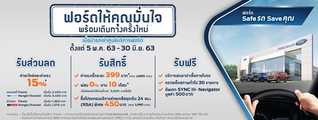 ฟอร์ด ประเทศไทย จัดแคมเปญ 'ฟอร์ดให้คุณมั่นใจ พร้อมเดินทางใหม่อีกครั้ง' แบ่งเบาภาระค่าใช้จ่ายลูกค้าครอบครัวฟอร์ด รวมบริการสุดพิเศษ ช่วยดูแลรถให้พร้อมสำหรับการใช้งานในทุกสถานการณ์ ทั้ง สิทธิพิเศษ ส่วนลดค่าอะไหล่และค่าแรง 15 เปอร์เซ็นต์ พร้อมส่วนลดโปรแกรม Ford Roadside Assistance บริการช่วยเหลือฉุกเฉิน 24 ชม. และสิทธิพิเศษอีกมากมาย เมื่อนำรถเข้ารับบริการที่ศูนย์บริการฟอร์ดทั่วประเทศ ตั้งแต่วันนี้ ถึง 30 มิถุนายน 2563