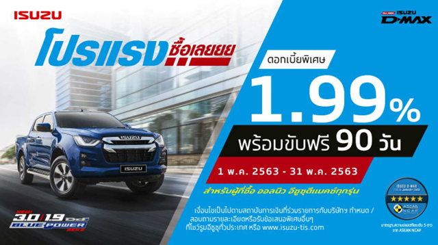 สำหรับผู้ซื้อ All-New Isuzu D-Max ทุกรุ่น รับดอกเบี้ยพิเศษ 1.99% (กรณีดาวน์ 25% ผ่อน 48 เดือน) โดยอ้างอิงอัตราดอกเบี้ย ณ เดือนพฤษภาคม 2563 และพร้อมขับฟรี 90 วัน (เริ่มชำระค่าเช่าซื้องวดแรกภายใน 90 วัน นับตั้งแต่วันที่สัญญาเช่าซื้อเริ่มต้น) สำหรับลูกค้าที่ทำสัญญาเช่าซื้อกับบริษัท ตรีเพชรอีซูซุลิสซิ่ง จำกัด ระหว่างวันนี้-31 พฤษภาคม 2563 และรับรถภายในวันที่ 31 พฤษภาคม 2563