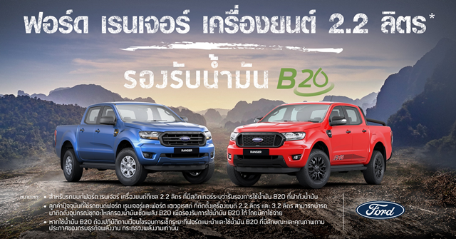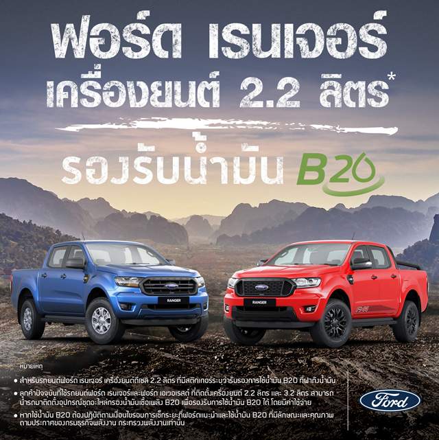 ฟอร์ด ประเทศไทย ประกาศรองรับการใช้น้ำมันไบโอดีเซล B20 เฉพาะที่มีคุณลักษณะและคุณภาพตามประกาศของกรมธุรกิจพลังงาน ในรถยนต์ฟอร์ด เรนเจอร์ ที่ติดตั้ง เครื่องยนต์ดีเซล 2.2 ลิตร ที่มีสติกเกอร์ B20 เพื่อสนับสนุนนโยบายของรัฐบาลในการส่งเสริมการใช้พลังงานทางเลือกที่มีส่วนช่วยลดมลภาวะและผลกระทบต่อสิ่งแวดล้อม