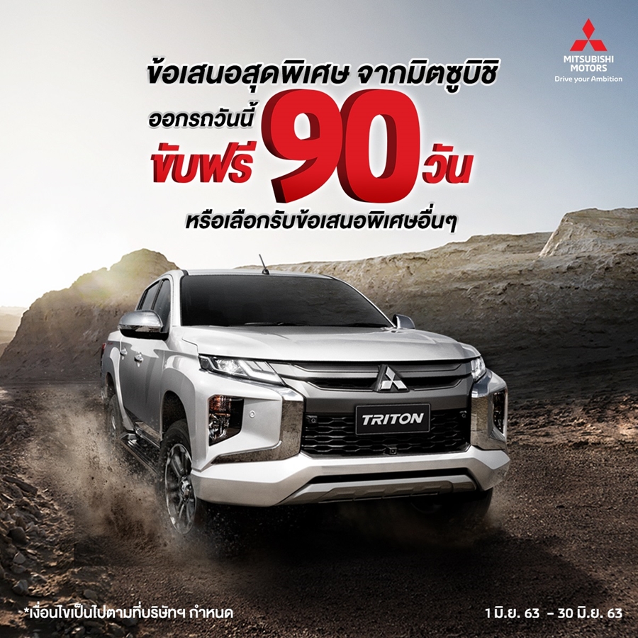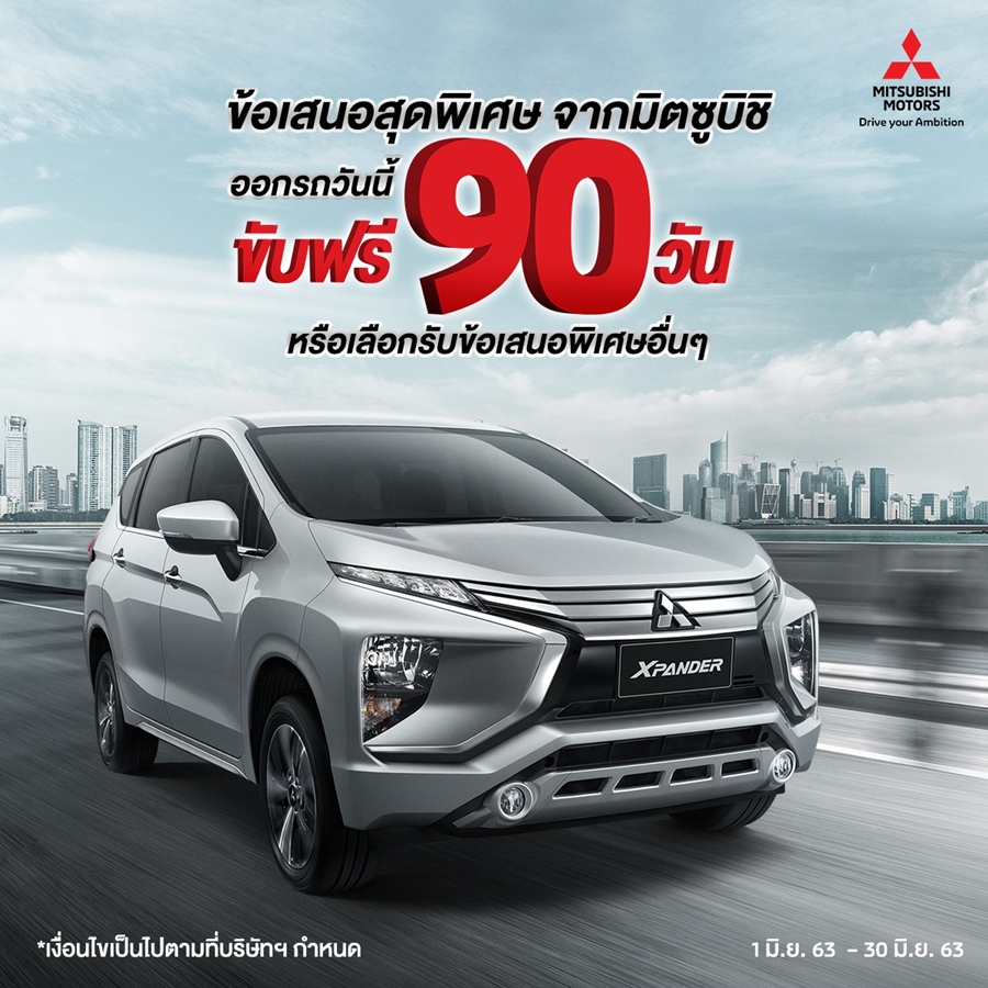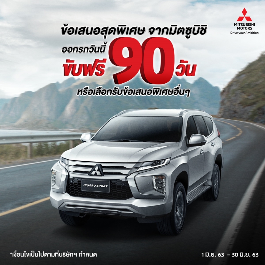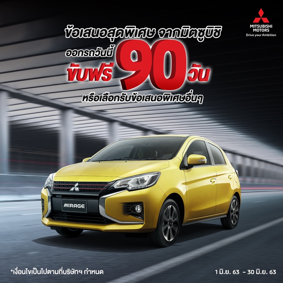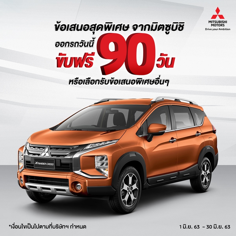 บริษัท มิตซูบิชิ มอเตอร์ส (ประเทศไทย) จำกัด มอบข้อเสนอสุดพิเศษ 'ขับฟรี 90 วัน' สำหรับลูกค้าที่ซื้อรถยนต์มิตซูบิชิรุ่นใดก็ได้ภายในวันที่ 30 มิถุนายน 2563 และรับรถภายในวันที่ 31 กรกฎาคม 2563 นี้ เมื่อทำสัญญาเช่าซื้อกับสถาบันการเงินที่ร่วมรายการ