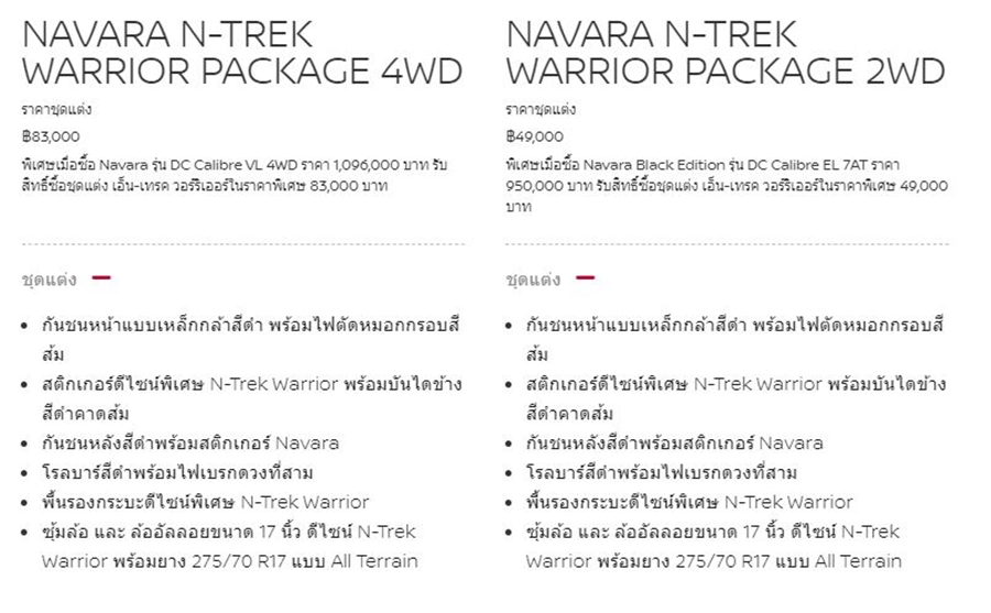 Nissan Navara DC Calibre VL 7AT 4WD ราคา 1,096,000 บาท รับสิทธิ์ซื้อชุดแต่ง N-Trek Warrior Package ราคา 83,000 บาท รวม 1,179,000 บาท