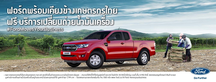 ฟอร์ด ประเทศไทย ร่วมเป็นส่วนหนึ่งในการขับเคลื่อนภาคธุรกิจให้เติบโต พร้อมผลักดันทุกย่างก้าวของเกษตรกรไทย ด้วยแคมเปญ ฟอร์ดพร้อมเคียงข้างคุณ #FordMovesYourBusiness มอบสิทธิ์รับบริการเปลี่ยนถ่ายน้ำมันเครื่อง ฟรี! ให้กับเกษตรกรไทยผู้ใช้รถกระบะทุกท่าน ที่โชว์รูมฟอร์ดทั่วประเทศ โดยเกษตรกรเจ้าของรถกระบะทุกยี่ห้อ สามารถนัดหมายเข้ารับบริการเปลี่ยนถ่ายน้ำมันเครื่องกับผู้จำหน่ายฟอร์ดล่วงหน้าผ่านแผนกลูกค้าสัมพันธ์ของศูนย์บริการ เพื่อเข้ารับบริการเปลี่ยนถ่ายน้ำมันเครื่องได้ตั้งแต่ วันที่ 1 ตุลาคม 2563 ถึง 25 ธันวาคม 2563
