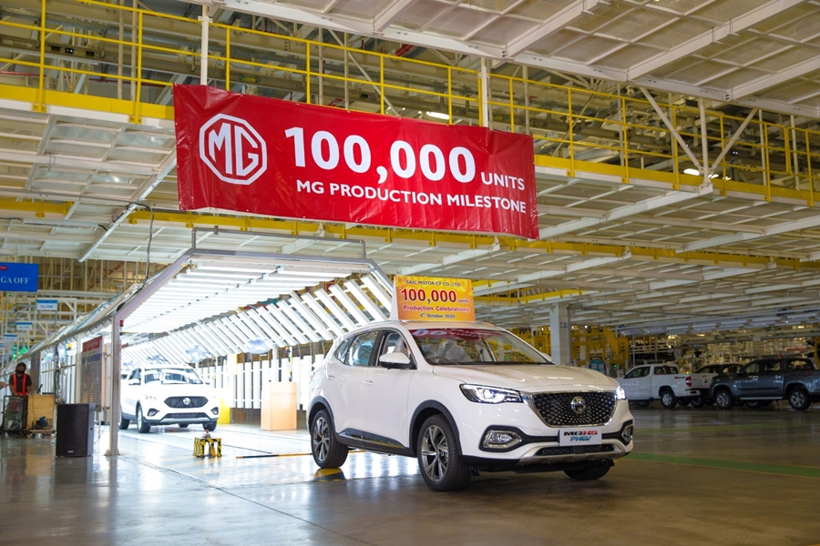 เมื่อเร็วๆ นี้ โรงงานผลิตรถยนต์เอ็มจีในประเทศไทยได้มียอดการผลิตสะสมครบ 100,000 คัน นับตั้งแต่การผลิตรถยนต์เอ็มจีรุ่นแรกในปี พ.ศ. 2557 โดยได้ผลิตรถยนต์เอ็มจีรุ่นต่างๆ ไปแล้ว 8 รุ่น ครอบคลุมทั้งรถยนต์นั่ง ได้แก่ MG6, MG 5, MG GS, MG 3, MG ZS, MG HS และรถกระบะ MG EXTENDER ซึ่งล่าสุดได้เริ่มผลิตรถยนต์ NEW MG HS PHEV รถยนต์ปลั๊กอินไฮบริดรุ่นแรกของเอ็มจี ซึ่งเตรียมเปิดตัวอย่างเป็นทางการในประเทศไทย และจัดแสดงต่อสาธารณชนเป็นครั้งแรก ที่งาน Fast Auto Show Thailand 2020 ในวันที่ 28 ตุลาคมนี้