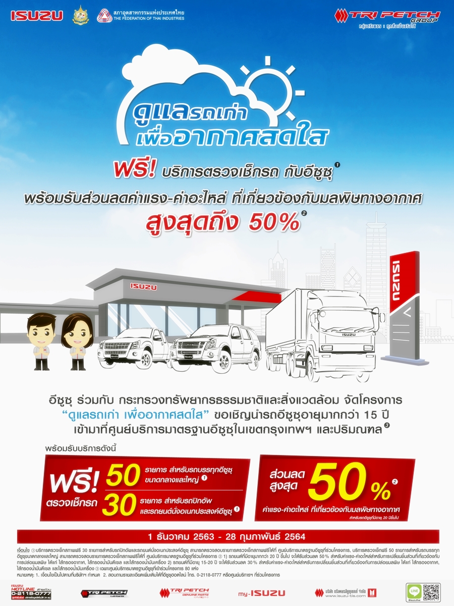 กลุ่มอีซูซุร่วมกับกระทรวงทรัพยากรธรรมชาติและสิ่งแวดล้อมเชิญชวนผู้ใช้รถเก่าเข้าศูนย์ ส่วนลดสูงสุด 50% เพื่อลดฝุ่น รณรงค์เชิญชวนลูกค้าเข้าร่วมโครงการ "ดูแลรถเก่า..เพื่ออากาศสดใส" โดยนำรถอีซูซุที่มีอายุเกินกว่า 15 ปี เข้าศูนย์บริการมาตรฐานอีซูซุ* รับบริการตรวจเช็คฟรีกว่า 30 รายการ สำหรับรถปิกอัพและรถนั่งอเนกประสงค์ และฟรีกว่า 50 รายการสำหรับรถบรรทุกขนาดกลางและใหญ่ พร้อมรับส่วนลดสูงสุดถึง 50%** สำหรับค่าแรงและค่าอะไหล่ที่เกี่ยวข้องกับการลดมลพิษทางอากาศ***