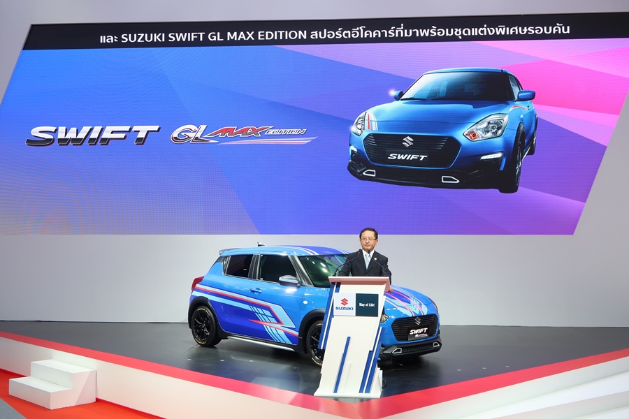 โดยผู้เข้าชมงานทุกท่านจะได้พบกับรถยนต์ของซูซูกิทุกรุ่น ไฮไลท์สำคัญ คือ SUZUKI SWIFT GL MAX Edition รุ่นตกแต่งพิเศษ ด้วยชุดสเกิร์ตรอบคัน สปอยเลอร์หลัง สติ๊กเกอร์ลายพิเศษรอบคัน และเสาอากาศครีบฉลาม ซึ่งพร้อมจะมาอวดโฉมให้ลูกค้าที่ชื่นชอบในความโดดเด่นและแตกต่างไม่ซ้ำใคร ในราคาเพียง 541,000 บาท