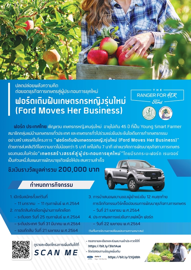 ฟอร์ด ประเทศไทย ร่วมกับ กรมส่งเสริมการเกษตรและพันธมิตร เดินหน้าขับเคลื่อนเกษตรกรยุค 4.0 เปิดตัวโครงการ "ฟอร์ดเติมฝันเกษตรกรหญิงรุ่นใหม่ (Ford Moves Her Business)" เชิญชวนเกษตรกรหญิงอายุไม่เกิน 45 ปี ที่เป็น Young Smart Farmer หรือสมาชิกกลุ่มแม่บ้านเกษตรกรทั่วประเทศ หรือเกษตรกรทั่วไป ที่ขึ้นทะบียนเกษตรกรด้วยตนเอง หรือเป็นสมาชิกในครัวเรือนเกษตรกรที่ขึ้นทะเบียนเกษตรกรกับหน่วยงานในสังกัดกระทรวงเกษตรและสหกรณ์ ร่วมส่งวิดีโอบอกเล่าเรื่องราวการทำการเกษตรของตนเอง พร้อมแนวคิดการเพิ่มมูลค่าผลผลิตทางการเกษตรด้วยการประยุกต์ใช้เทคโนโลยีอย่างสร้างสรรค์ โดยมีรถกระบะฟอร์ด เรนเจอร์ เป็นส่วนหนึ่งในการช่วยพัฒนาธุรกิจให้ประสบความสำเร็จ และสร้างแรงบันดาลใจให้กับผู้อื่น เพื่อชิงรางวัลเงินทุนสนับสนุนนำไปต่อยอดธุรกิจมูลค่าสูงสุด 100,000 บาท และสิทธิพิเศษในการทดลองขับ ฟอร์ด เรนเจอร์ ใหม่นาน 3 เดือนสำหรับผู้ชนะกิจกรรม