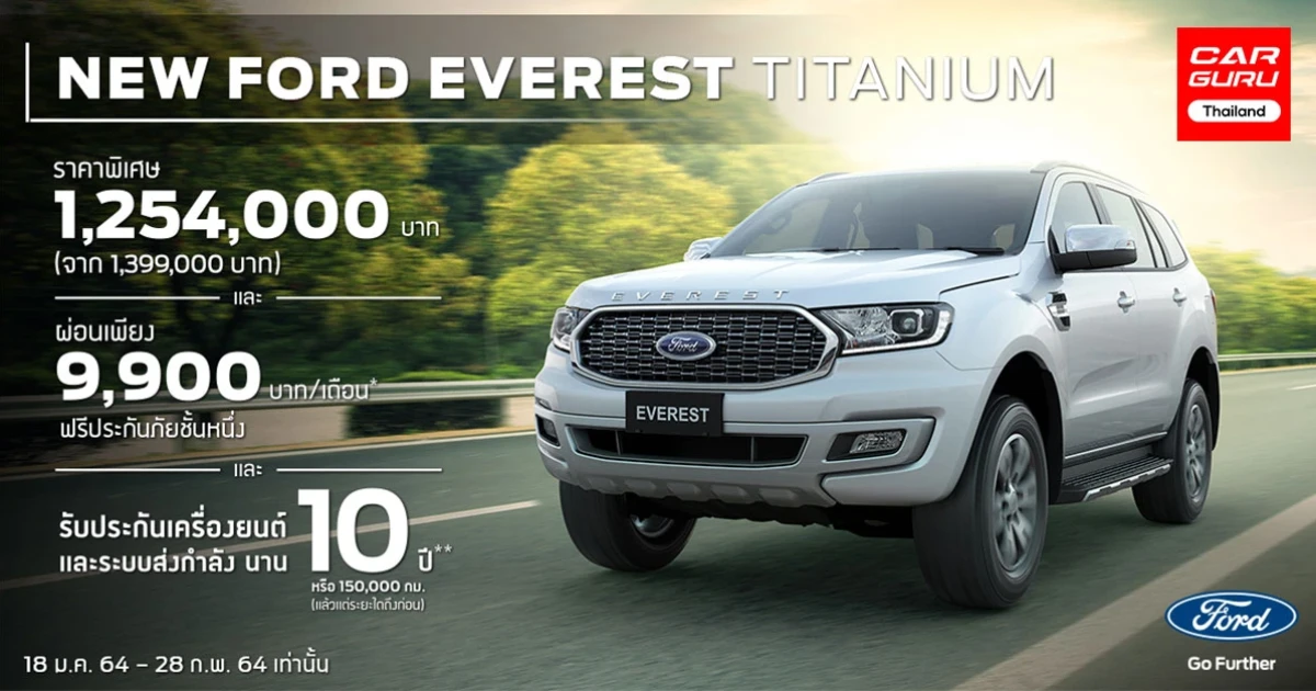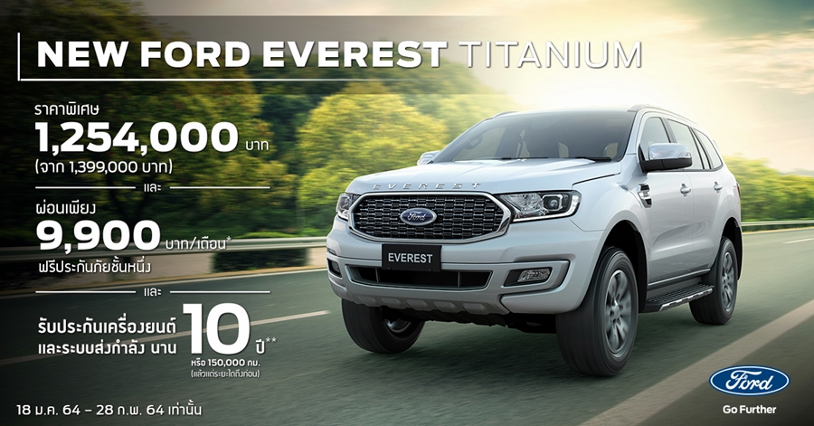 ข้อเสนอสุดพิเศษนี้มีจำนวนจำกัด เมื่อจองและออกรถ ฟอร์ด เอเวอเรสต์ ใหม่ รุ่นไทเทเนี่ยม ที่โชว์รูมฟอร์ดทั่วประเทศ ตั้งแต่วันที่ 18 มกราคม 2564 ถึง 28 กุมภาพันธ์ 2564 และจัดไฟแนนซ์ผ่านฟอร์ด ลีสซิ่ง โดยธนาคารทิสโก้ จำกัด (มหาชน) เท่านั้น
