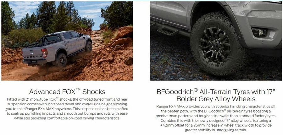 ฟอร์ด เรนเจอร์ FX4 เพิ่มชื่อ MAX ต่อท้ายเหมือนเป็นการบ่งบอกความเป็น "ที่สุด" และน่าติดตามการปรับเปลี่ยนโฉมหลังจากที่เคยมีการอัพเกรดรุ่น FX4 ที่ใส่ชุดตกแต่งทั้งสติ๊กเกอร์ โรลบาร์ กันชน ล้ออัลลอย โดยในต่างประเทศที่เปิดตัวรุ่น FX4 MAX ในชื่อเดียวกันนี้ มีความพิเศษตรงที่ใช้ระบบช่วงล่างคอยล์สปริง 4 ล้อ และใช้โช้คอัพ monotube FOX เหมือนที่ใช้ใน Ranger Raptor