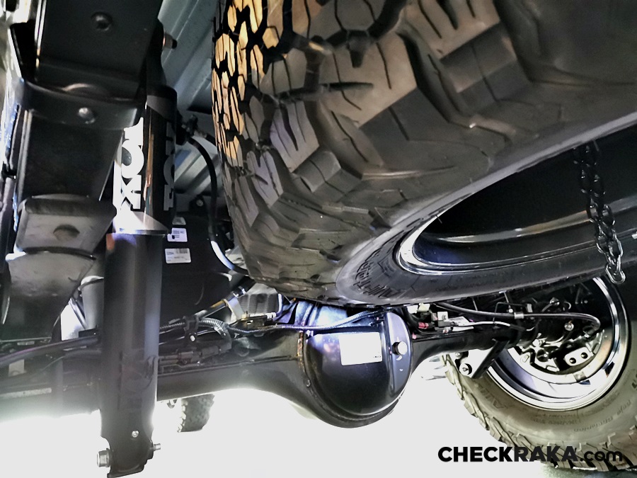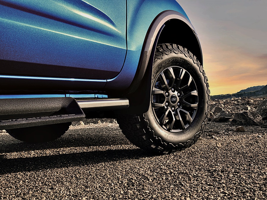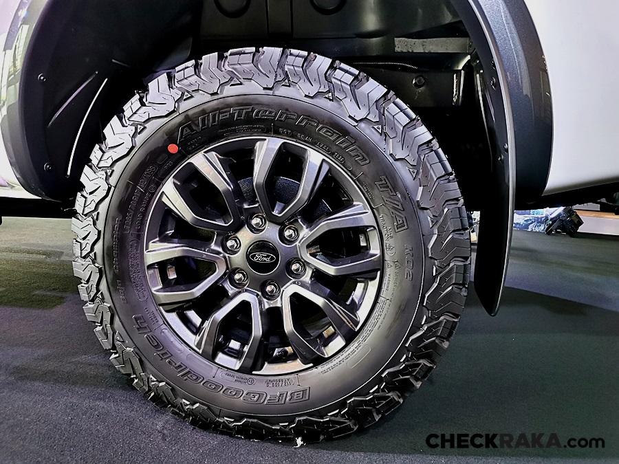 สะท้อนสมรรถนะและความสมบุกสมบัน ด้วยการปรับจูนระบบกันสะเทือนและช่วงล่างใหม่เพื่อตอบสนองการขับขี่ออฟโรดที่ดีเยี่ยม พร้อมยางออลเทอร์เรน KO2 จาก BF Goodrich เช่นเดียวกับรถกระบะดีเอ็นเอฟอร์ด เพอร์ฟอร์มานซ์อย่างฟอร์ด เรนเจอร์ แร็พเตอร์ ด้วยยางขนาด 265/70 R17 มั่นคงในการยึดเกาะถนนที่มีพื้นผิวขรุขระ และพื้นผิวด้านข้างที่คงทนยิ่งขึ้น เข้ากับล้ออัลลอยขนาด 17 x 8 นิ้ว สีเทาเข้มดุดัน ซึ่งเป็นสีเดียวกับกระจังหน้า ทั้งด้านหน้าและหลัง ออฟเซ็ท +42 มม. (จากเดิมในรุ่น XLT ประมาณ +55) ทำให้ฐานล้อกว้างขึ้นถึง 26 มม. ขณะที่ล้ออะไหล่เป็นล้ออัลลอยพร้อมยางออลเทอร์เรนเช่นกัน คิ้วล้อดีไซน์ใหม่เพื่อเน้นความโดดเด่นของฐานล้อที่กว้างขึ้น