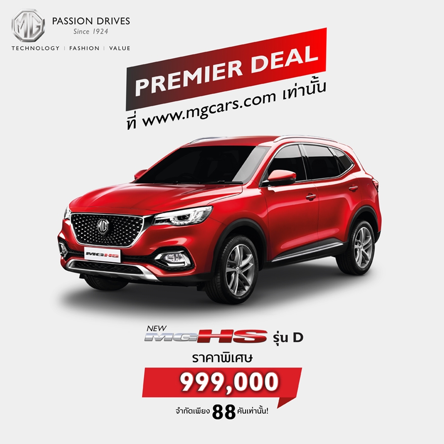 ข้อเสนอพิเศษสำหรับลูกค้าที่จอง MG HS รุ่น D ผ่าน https://onlinebooking.mgcars.com/ ในระหว่างวันที่ 5 ถึง 31 พฤษภาคม 2564 และรับรถยนต์ภายใน 30 มิถุนายน 2564 ราคาพิเศษ 999,000 บาท, ดาวน์เริ่มต้น 5%, ดอกเบี้ย 0 % นาน 4 ปี, พิเศษ ขยายระยะเวลารับประกันคุณภาพรถยนต์ 5 ปี, ฟรี! ประกันภัยชั้นหนึ่ง พร้อม พ.ร.บ. นาน 1 ปี