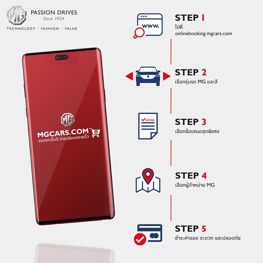 ด้วยช่องทางการขายออนไลน์ของเอ็มจี ซึ่งเป็นการสร้างพื้นที่โชว์รูมรูปแบบใหม่ที่ทุกคนสามารถเข้าถึงได้แบบเรียลไทม์จากสมาร์ทโฟนหรือเครื่องคอมพิวเตอร์ ทำให้ลูกค้าสามารถเป็นเจ้าของรถยนต์เอ็มจีได้ง่ายและสะดวกขึ้น ผ่าน 5 ขั้นตอนง่ายๆ เพียงแค่ 1) เข้าไปที่ https://onlinebooking.mgcars.com/ 2) เลือกรุ่นและสีรถ 3) เลือกข้อเสนอพิเศษ 4) เลือกผู้จำหน่าย และ 5) ชำระค่าจอง