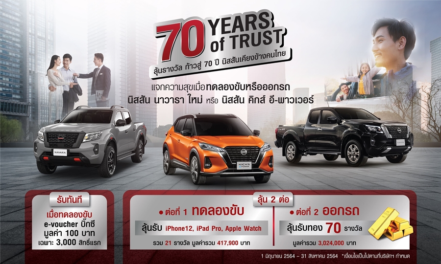 นิสสัน ประเทศไทย ก้าวสู่ปีที่ 70 ฉลองการยืนหยัดเคียงข้างคนไทย โดยมอบแคมเปญพิเศษ ขอบคุณลูกค้าเมื่อทดลองขับหรือออกรถ นิสสัน นาวารา ใหม่ และ นิสสัน คิกส์ อี-พาวเวอร์ ลุ้นรับอุปกรณ์ไอที มือถือ และทองคำ รวมเกือบ 100 รางวัล ตั้งแต่วันนี้ถึงวันที่ 31 สิงหาคม 2564
