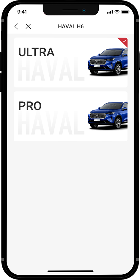 เลือกรุ่นของ All New HAVAL H6 Hybrid SUV ที่ต้องการ โดยมีให้เลือก 2 รุ่น ได้แก่ รุ่น ULTRA และรุ่น PRO (โดยผู้จองสิทธิ์สามารถดูรายละเอียดผลิตภัณฑ์ทั้ง 2 รุ่นได้จากข้อมูลผลิตภัณฑ์ภายใน GWM Application และเว็บไซต์ WWW.GWM.CO.TH ก่อนทำการจองสิทธิ์)
