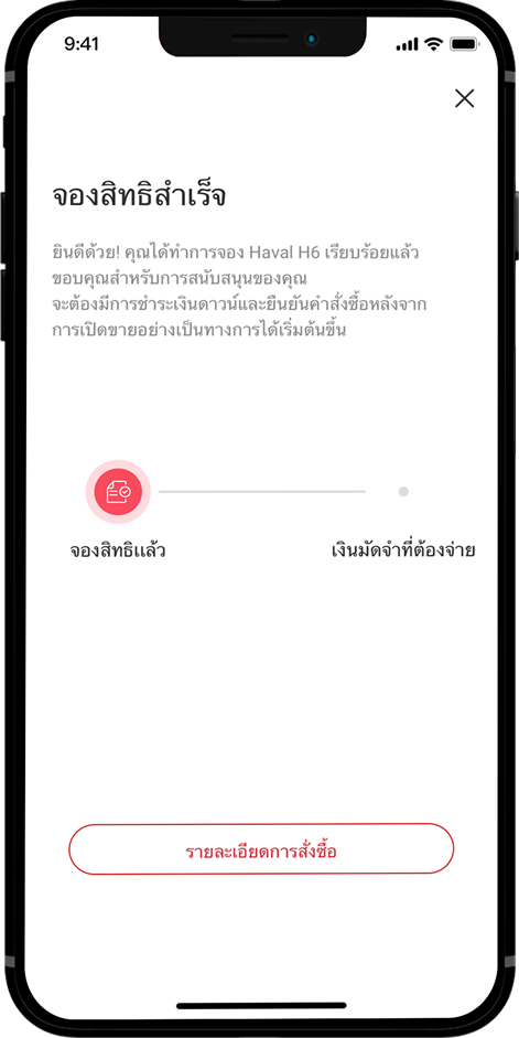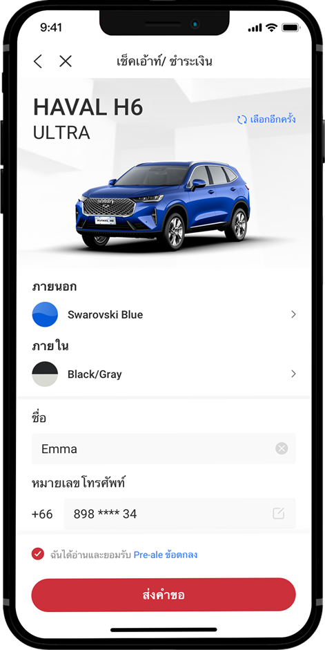 กรอกข้อมูลส่วนตัว รวมทั้งชื่อ และเบอร์โทรศัพท์ ให้ครบถ้วน พร้อมกด “ส่งคำขอ” หรือ “RESERVE NOW” เพื่อยืนยันการจองสิทธิ์ลงทะเบียนเพื่อซื้อ All New HAVAL H6 Hybrid SUV หลังจากนั้นจะมีข้อความยืนยันการจองเมื่อดำเนินการเสร็จสิ้นเรียบร้อยแล้ว