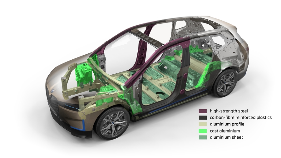 โครงสร้างตัวถัง ปรัชญาการดีไซน์ และการออกแบบแชสซีของบีเอ็มดับเบิลยู iX ได้รับการพัฒนาเพื่อหลอมรวมความสะดวกสบายเหนือระดับในการขับขี่และการควบคุมที่โฉบเฉี่ยวสไตล์สปอร์ต โครงสร้างของบีเอ็มดับเบิลยู iX มาในวัสดุอลูมิเนียมแบบ spaceframe ส่วนหลังคามาในโครงสร้าง Carbon Cage ซึ่งประกอบด้วยวัสดุคาร์บอนไฟเบอร์บริเวณด้านข้างและด้านหลัง ผสานการใช้วัสดุสองประเภทเข้าไว้ด้วยกันเพื่อเสริมทั้งความแข็งแกร่งและลดน้ำหนักให้เบาลงได้อย่างชาญฉลาด