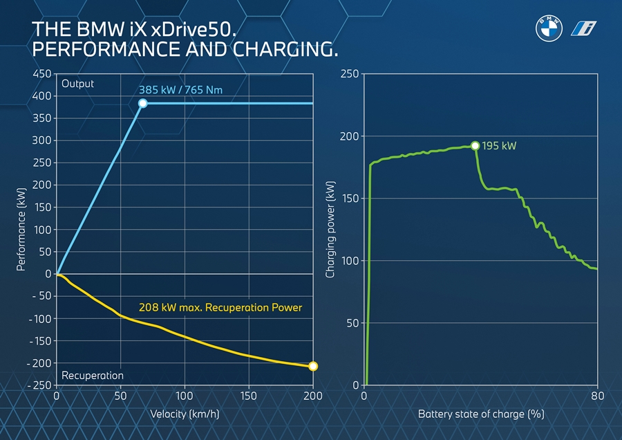 แบตเตอรี่แรงดันสูงในบีเอ็มดับเบิลยู iX xDrive50 Sport มีความจุพลังงานรวม 111.5 กิโลวัตต์ชั่วโมง หัวชาร์จแบบ Combined Charging Unit (CCU) ได้รับการออกแบบมาเพื่อมอบการชาร์จที่ยืดหยุ่น รองรับการชาร์จแบบ DC ได้สูงสุด 200 กิโลวัตต์ และสำหรับการชาร์จจากเครื่องชาร์จ 100 กิโลวัตต์นั้น จะใช้เวลาราว 56 นาที ในการชาร์จจาก 10% ถึง 80%