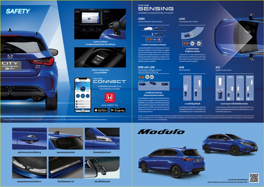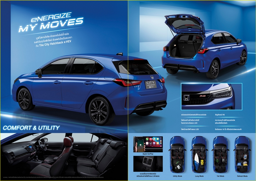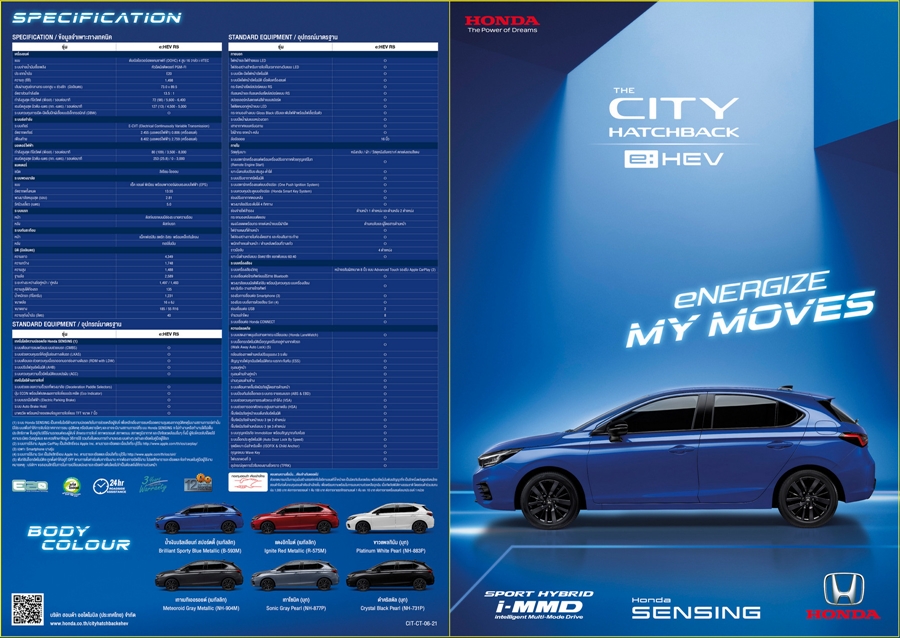 บริษัท ฮอนด้า ออโตโมบิล (ประเทศไทย) จำกัด ตอกย้ำตำแหน่งผู้บุกเบิกและผู้นำเซกเมนต์ซิตี้คาร์ในประเทศไทย เปิดตัว ฮอนด้า ซิตี้ แฮทช์แบ็ก อี:เอชอีวี ใหม่ ครั้งแรกในโลก ยนตรกรรมซิตี้คาร์แฮทช์แบ็กฟูลไฮบริด ที่จะมาเสริมความแข็งแกร่งของไลน์อัปไฮบริดของฮอนด้าไปอีกขั้น และเติมเต็มความสมบูรณ์แบบของ “เดอะ ซิตี้ ซีรีส์” (The City Series) มาพร้อมจุดเด่นเทคโนโลยี Full Hybrid อันทรงพลัง กับระบบขับเคลื่อน Sport Hybrid i-MMD มั่นใจในทุกการขับขี่ด้วยเทคโนโลยีความปลอดภัยอัจฉริยะ “ฮอนด้า เซนส์ซิ่ง” (Honda SENSING) พร้อมด้วยเอกลักษณ์ความอเนกประสงค์กับเบาะนั่ง อัลตราซีท (ULTR) ครบครันด้วยเทคโนโลยีเพื่อความปลอดภัยและฟังก์ชันการใช้งานระดับพรีเมียม ดีไซน์สปอร์ตทั้งภายนอกและภายใน ด้วยดีไซน์สไตล์ RS รอบคัน เสริมเอกลักษณ์ยนตรกรรมไฮบริดด้วยโลโก้ H Mark ตกแต่งกรอบสีฟ้า และโลโก้ e:HEV พร้อมแนะนำสีใหม่สุดเอกซ์คลูซีฟกับสีน้ำเงินบริลเลียนท์ สปอร์ตตี้ (เมทัลลิก) เสริมความมั่นใจในการใช้งานด้วยการรับประกันอายุการใช้งานแบตเตอรี่ไฮบริดถึง 10 ปี และรับประกันระบบไฮบริดทั้งระบบ 5 ปี ไม่จำกัดระยะทาง* อีกทั้งฟรีค่าแรงในการเช็กระยะเป็นเวลา 5 ปี หรือ 100,000 กิโลเมตร* (อย่างใดอย่างหนึ่งถึงก่อน) คุ้มค่าเกินคลาส ด้วยราคาจำหน่ายรุ่น e:HEV RS 849,000 บาท