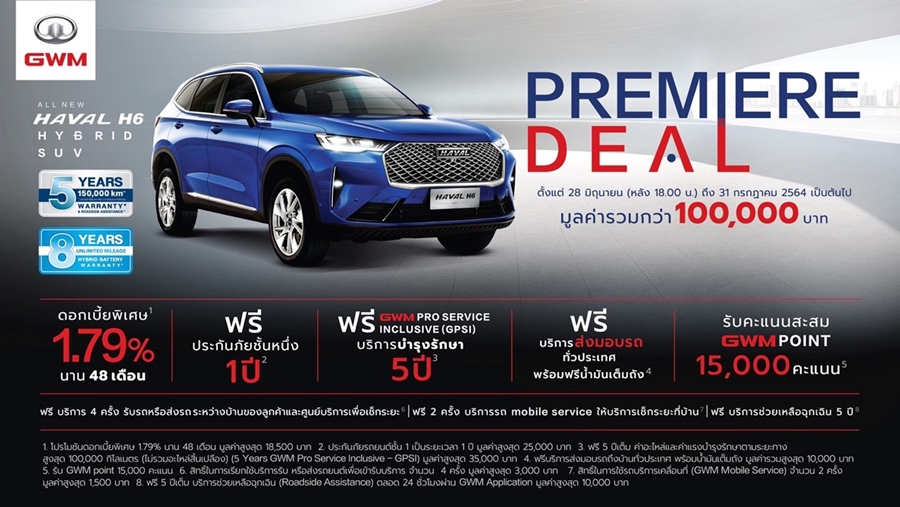 นอกจากนี้ All New HAVAL H6 Hybrid SUV ทั้ง 2 รุ่น ยังมาพร้อมการรับประกันและรูปแบบของแพคเกจเซอร์วิสต่างๆ ที่จะทำให้ลูกค้าหมดกังวลกับการใช้รถและการดูแลรักษาในระยะยาว ด้วยการรับประกันคุณภาพตัวรถ (Factory Warranty & Roadside Assistance) ครอบคลุมระยะเวลา 5 ปี หรือระยะทาง 150,000 กิโลเมตร และการรับประกันแบตเตอรี่แบบไม่จำกัดระยะทางนานถึง 8 ปีเต็ม