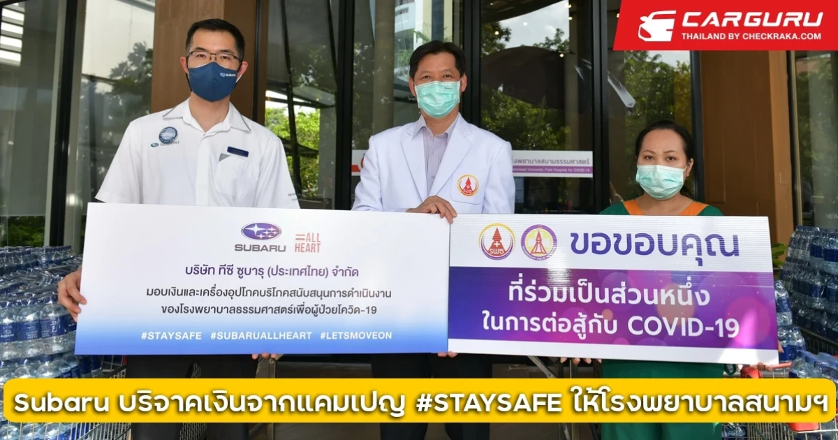 บริษัท ทีซี ซูบารุ (ประเทศไทย) จำกัด เป็นตัวแทนครอบครัวซูบารุมอบเงินจากกิจกรรม #STAYSAFE เพื่อเป็นกำลังใจและสนับสนุนการทำงานของบุคลากรทางการแพทย์ โดยกิจกรรม #STAYSAFE เป็นกิจกรรมออนไลน์ที่เปิดโอกาสให้คนไทยได้ส่งกำลังใจผ่านข้อความแคปชั่นและกรอบรูปเฟซบุ๊คในระหว่างวันที่ 13 พฤษภาคม – 25 มิถุนายน ที่ผ่านมา และได้รับเสียงตอบรับอย่างล้นหลามทำให้สามารถ รวบรวมเงินบริจาคสูงสุด 70,000 บาท ในการสนับสนุนการทำงานของแพทย์และบุคลากรทางการแพทย์ของโรงพยาบาลธรรมศาตร์ที่ยังคงดูแลผู้ป่วยโควิด-19 อย่างต่อเนื่อง