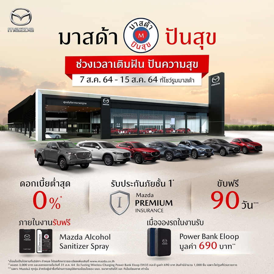มาสด้า สานฝันลูกค้าที่ต้องการออกรถใหม่ในเดือนสิงหาคมกับโครงการ มาสด้า ปันสุข ช่วงเวลาเติมฝัน ปันความสุข เพื่อส่งมอบความสุขให้กับลูกค้าที่สนใจรถยนต์มาสด้า รวมทั้งมอบสิทธิพิเศษมากมายสำหรับลูกค้าปัจจุบัน ด้วยข้อเสนอสุดพิเศษดอกเบี้ยต่ำสุด 0%1 ฟรีประกันภัยชั้น 1 Mazda Premium Insurance1 ขับฟรี 90 วัน2 และฟรี Fast Wireless Charging Power Bank Eloop EW353 โดยจัดกิจกรรมขึ้นในระหว่างวันที่ 7 – 15 สิงหาคม 2564 ที่โชว์รูมมาสด้าทั่วประเทศ