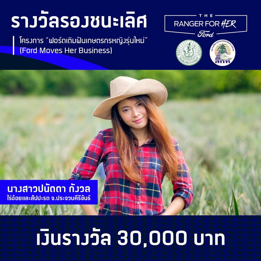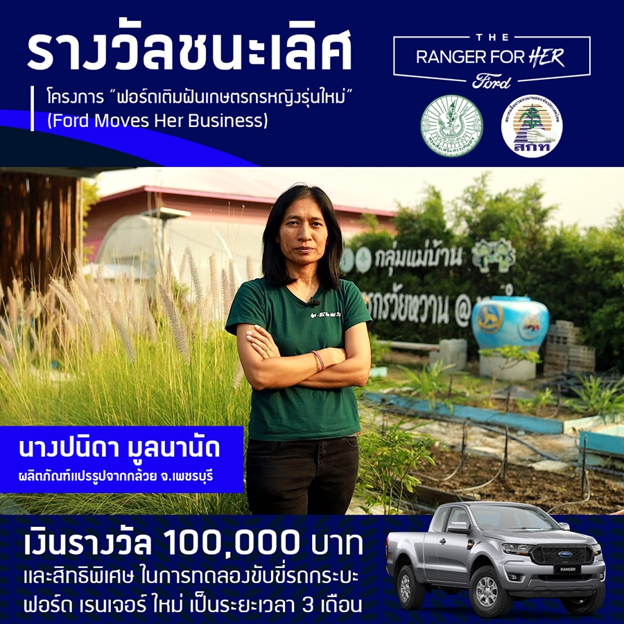 นางปนิดา มูลนานัด เกษตรกรหญิงผู้ทำธุรกิจแปรรูปกล้วยเพิ่มมูลค่าผลผลิตทางการเกษตร จากจังหวัดเพชรบุรี จะได้รับรางวัลเป็นทุนต่อยอดธุรกิจมูลค่า 100,000 บาท และสิทธิพิเศษในการทดลองขับรถกระบะ ฟอร์ด เรนเจอร์ เป็นระยะเวลา 3 เดือน