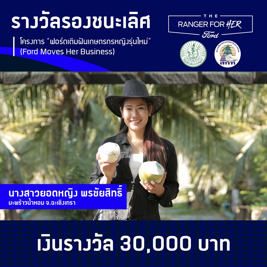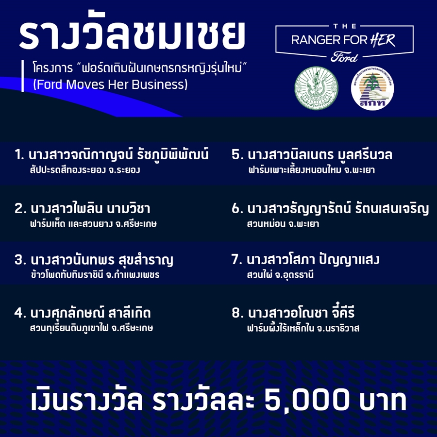สำหรับผู้ที่ได้รับรางวัลชนะเลิศจากโครงการ ฟอร์ดเติมฝันเกษตรกรหญิงรุ่นใหม่ (Ford Moves Her Business) ได้แก่