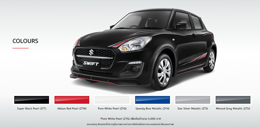 ทั้งนี้ ยังมาพร้อมแคมเปญสุดพิเศษเพื่อให้คุณสามารถเป็นเจ้าของรถยนต์สปอร์ตแฮทช์แบ็กอีโคคาร์รุ่นนี้ได้ง่ายมากยิ่งขึ้น สำหรับผู้ที่จอง SUZUKI SWIFT GL PLUS เร้าใจเต็มสปีด สุดขีดสไตล์พลัส รายละเอียดและเงื่อนไขต่างๆ เป็นไปตามที่บริษัทฯ กำหนด เป็นต้น”