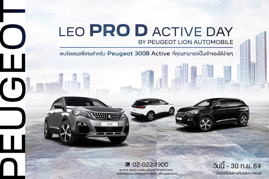 บริษัท เปอโยต์ ไลอ้อน ออโตโมบิล (ประเทศไทย) จำกัด ผู้แทนจำหน่ายรถยนต์ เปอโยต์ อย่างเป็นทางการในประเทศไทย เปิดโอกาสให้ลูกค้าได้จับจองรถยนต์ เปอโยต์ 3008 ACTIVE ที่มาพร้อมข้อเสนอสุดพิเศษ ภายในงาน LEO PRO D ACTIVE DAY วันนี้ ถึงสิ้นเดือนกันยายน 2564 ที่โชว์รูม เปอโยต์ ไลอ้อน ออโตโมบิล ทุกสาขา