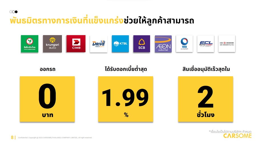 CARSOME พร้อมยกระดับความสะดวกสบายไปอีกขั้น ด้วยการจับมือกับพันธมิตรสถาบันการเงินที่แข็งแกร่ง ช่วยผลักดันให้สามารถส่งมอบสิทธิประโยชน์สูงสุดให้แก่ลูกค้า อาทิ ออกรถ 0 บาท ดอกเบี้ยต่ำสุดที่ 1.99% การอนุมัติคำขอสินเชื่อได้ด้วยเวลาเร็วสุดที่ภายใน 2 ชั่วโมง และอัตราการอนุมัติสินเชื่อสูงถึง 95% นอกจากนี้ CARSOME ยังได้เปิดเผยรถยนต์ 5 รุ่นขายดีที่สุด ได้แก่ โตโยต้า ยาริส, มาสด้า2, ฮอนด้า ซีวิค, ฮอนด้า ซิตี้ และ โตโยต้า วีออส