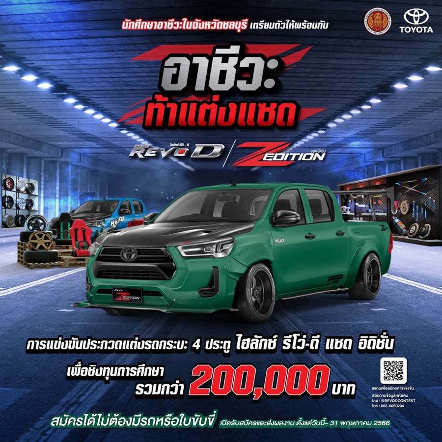บริษัท โตโยต้า มอเตอร์ ประเทศไทย จำกัด ร่วมกับ สำนักงานคณะกรรมการอาชีวะ จ.ชลบุรี จัดการแข่งขัน อาชีวะ ท้าแต่งแซด กับไฮลักซ์ รีโว่-ดี แซดอิดิชั่น เป็นครั้งแรก โดยเป็นการแข่งขันรถกระบะไฮลักซ์ รีโว่-ดี แซดอิดิชั่น 4 ประตู ส่งเสริมความคิดสร้างสรรค์ มอบโอกาสนักเรียนอาชีวะได้เสริมทักษะวิชาชีพด้านการแต่งรถ ทั้งการแสดงไอเดีย การลงมือปฏิบัติแต่งรถจริง ภายใต้หลักการ แต่งรถอย่างไม่ผิดข้อกฎหมาย เพื่อยกระดับวงการรถกระบะแต่งในประเทศไทยให้มีความสร้างสรรค์มากยิ่งขึ้น ร่วมลุ้นการแข่งขันรอบสุดท้ายได้ในวันที่ 25 มิถุนายน ศกนี้ ณ TOYOTA ALIVE PARK หรือรับชมผ่านช่องทางออนไลน์ Facebook Page: TOYOTA Hilux REVO Thailand ตั้งแต่เวลา 9.30 น. เป็นต้นไป