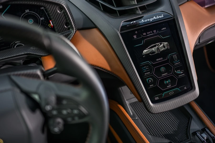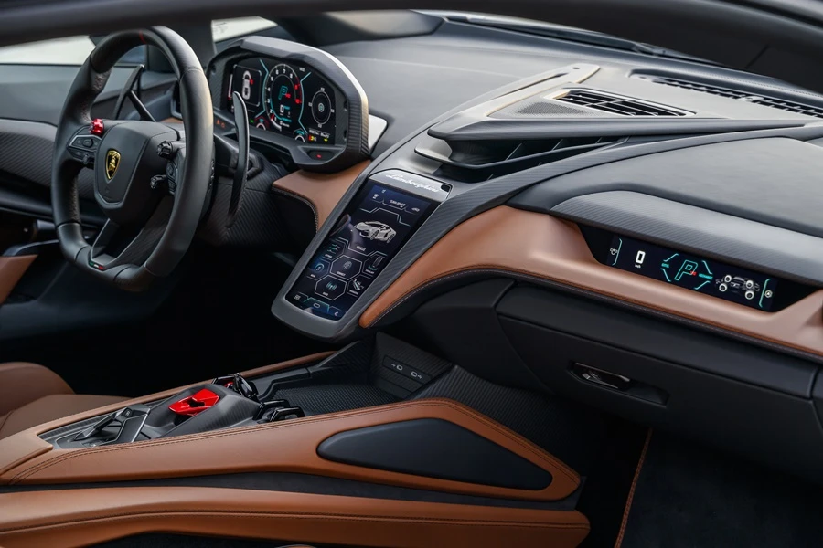 การตกแต่งภายในยังสะท้อนถึงดีไซน์ใหม่แห่งโลกอนาคตของตัวรถภายนอก โดยทุกองค์ประกอบของห้องโดยสารยังคงแบบฉบับของลัมโบร์กินีอย่างชัดเจน โดยผสานดุลยภาพแห่งประสบการณ์ยุคดิจิทัลเข้ากับสัมผัสทางกายภาพได้อย่างสมบูรณ์แบบ ทั้งเพื่อการขับขี่ในชีวิตประจำวันและการพุ่งทะยานในสนามแข่ง จุดรวมสายตาในห้องโดยสารนำเสนอการใช้วัสดุคาร์บอนไฟเบอร์อย่างโดดเด่น ผ่านการออกแบบสไตล์ ยานอวกาศ ที่โอบล้อมช่องแอร์กลางและจอแสดงผลทัชสกรีนแนวตั้งขนาด 8.4 นิ้ว ซึ่งถือเป็นหัวใจแห่งเทคโนโลยีของรถยนต์รุ่นนี้