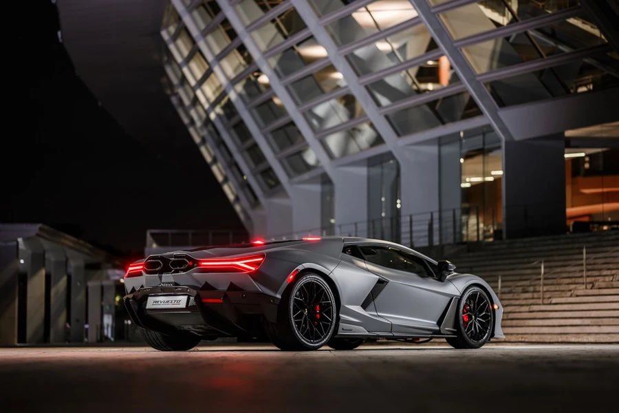 การออกแบบส่วนท้ายรถให้ความสำคัญกับการติดตั้งระบบไฮบริดเครื่องยนต์ V12 ซึ่งเครื่องยนต์ที่ติดตั้งตามแนวยาวแบบเปิดโล่งซึ่งถือเป็นหัวใจสำคัญของ Revuelto นี้จะเชื่อมต่อไปยังชุดท่อไอเสียคู่รูปหกเหลี่ยมให้เห็นอย่างชัดเจน และเสริมความโดดเด่นด้วยปีกทรงเรขาคณิต โอบล้อมด้วยชุดไฟหน้ารูปตัว Y อันเป็นดีไซน์ไฟระดับซิกเนเจอร์ของลัมโบร์กินี ซึ่งดีไซน์รูปตัว Y เป็นมาตรฐานการออกแบบภายในที่กำหนดให้ผู้ขับมีความสำคัญมากที่สุดตามปรัชญา Feel like a pilot ของแบรนด์