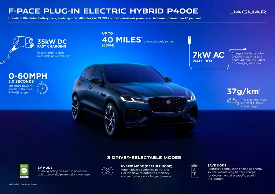 Jaguar F-Pace ระบบไฟฟ้าปลั๊กอินไฮบริดใหม่ (PHEV) มาพร้อมกับระบบส่งกำลังไฟฟ้าและชุดแบตเตอรี่ลิเธียมไอออนขนาดใหญ่ขึ้นกว่าเดิม 20% โดยมีขนาดแบตเตอรี่อยู่ที่ 19.2 กิโลวัตต์ชั่วโมง สามารถขับขี่ด้วยไฟฟ้าอย่างเดียวสูงสุด 65 กิโลเมตร (ตามมาตราฐาน WLTP) ช่วยลดการปล่อยก๊าซคาร์บอนไดออกไซด์และการใช้เชื้อเพลิงในปัจจุบันให้เหลือต่ำสุดเพียง 37 กรัม/กิโลเมตร และสูงสุดที่ 1.6 ลิตร/ 100กิโลเมตร (WLTP TEL)1 P400e มาพร้อมด้วยเครื่องยนต์เบนซิน 4 สูบรวมกับมอเตอร์ไฟฟ้าสามารถทำกำลังสูงสุดที่ 404 แรงม้า และแรงบิด 640 นิวตันเมตร ให้อัตราเร่ง 0-100 กิโลเมตรต่อชั่วโมงภายในเวลาเพียง 5.3 วินาที ระบบขับเคลื่อนอัจฉริยะ 4 ล้ออันเลื่องชื่อที่สามารถปรับโหมดได้หลายรูปแบบตามสภาวะถนนที่ขับขี่ และระบบเกียร์อัตโนมัติ 8 สปีดพร้อมดีไซน์ด้ามเกียร์ใหม่ เพิ่มความหรูหราและความประณีตที่ช่วยส่งมอบสมดุลของสมรรถนะความคล่องตัว และการตอบสนองในอุดมคติอย่างที่ผู้ขับขี่สามารถคาดหวังได้จากแบรนด์ Jaguar เสมอ