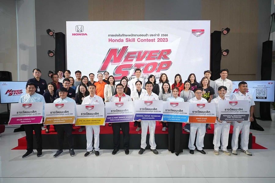 บริษัท ฮอนด้า ออโตโมบิล (ประเทศไทย) จำกัด จัดการแข่งขันทักษะพนักงานฮอนด้า ประจำปี 2566 (Honda Skill Contest 2023) ค้นหาสุดยอดพนักงานด้านการขายและบริการหลังการขายที่มีทักษะและความเชี่ยวชาญเป็นเลิศทั้งหมด 10 ประเภท จากโชว์รูมและศูนย์บริการฮอนด้า 222 แห่งทั่วประเทศ พร้อมเดินหน้ายกระดับมาตรฐานและคุณภาพการปฏิบัติงานของพนักงาน เพื่อส่งมอบการบริการอย่างมืออาชีพ สร้างความมั่นใจและความพึงพอใจแก่ลูกค้าอย่างสูงสุด โดยจัดการแข่งขันรอบชิงชนะเลิศ เมื่อวันที่ 23 - 24 กันยายนที่ผ่านมา ณ สำนักงานขายและบริการ บริษัท ฮอนด้า ออโตโมบิล (ประเทศไทย) จำกัด