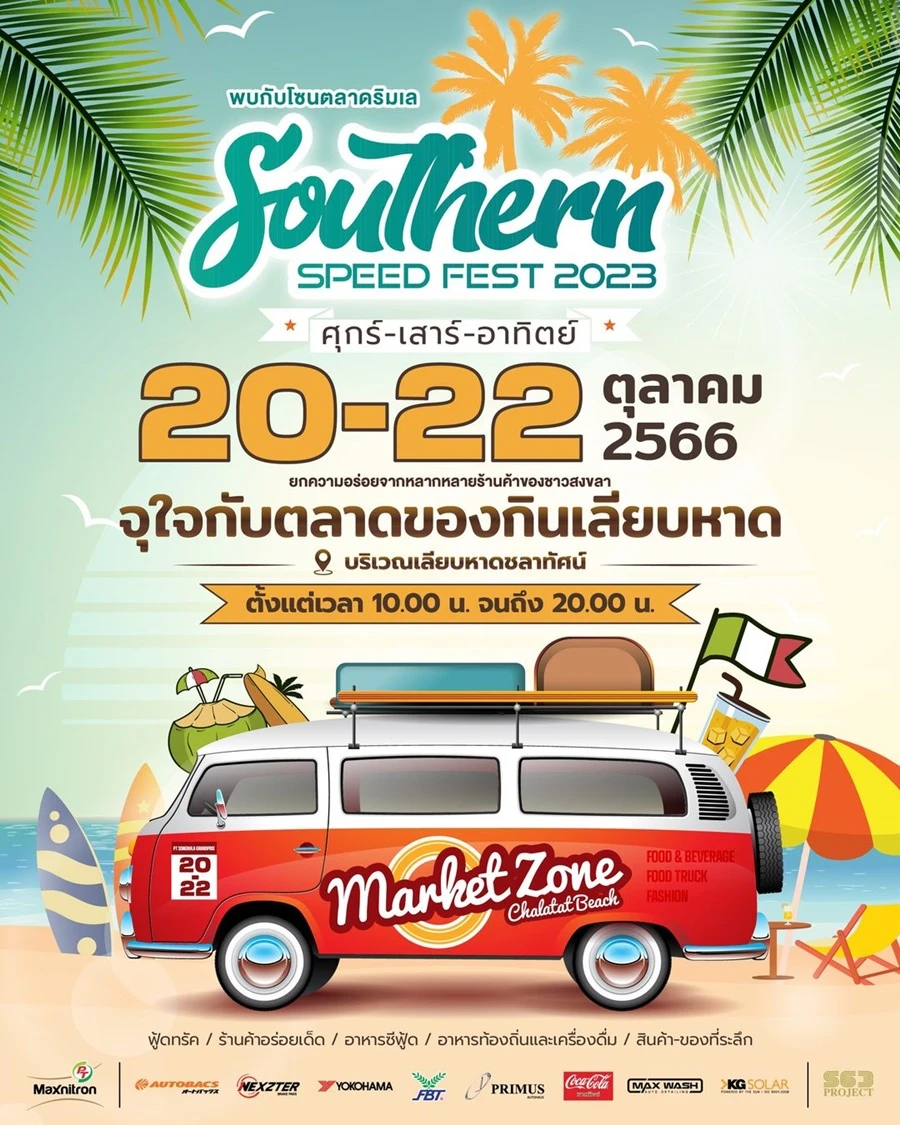 นอกจากนี้ ยังมีโซน Market ที่รวมเอาร้านอาหารขึ้นชื่อของท้องถิ่นกว่า 80 ร้าน มาเสิร์ฟให้นักท่องเที่ยวทั้งชาวไทยและต่างชาติ ได้เต็มอิ่มกับอาหารที่หลากหลายระหว่างเข้าชมการแข่งขัน ณ บริเวณ Southern Speed Fest เลียบหาดชลาทัศน์
