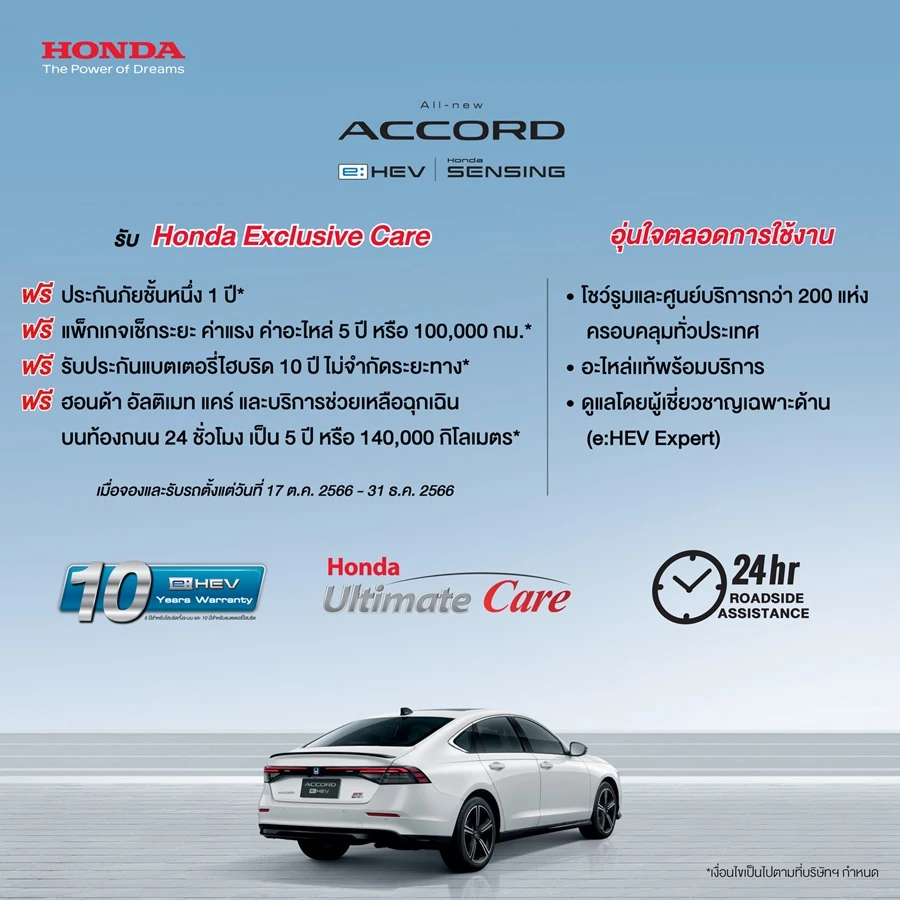 มาพร้อม Honda Exclusive Care ให้ลูกค้าขับ ฮอนด้า แอคคอร์ด อี:เอชอีวี ใหม่ ได้อย่างมั่นใจและอุ่นใจ ประกอบด้วยฟรีประกันภัย 1 ปี ฟรีรับประกันอายุการใช้งานแบตเตอรี่ไฮบริดถึง 10 ปี และรับประกันระบบไฮบริดทั้งระบบ 5 ปี ไม่จำกัดระยะทาง อีกทั้งฟรีแพ็กเกจเช็กระยะ ค่าแรง ค่าอะไหล่ 5 ปี หรือ 100,000 กม. และฟรี Honda Ultimate Care ขยายการรับประกันคุณภาพรถยนต์ใหม่และบริการช่วยเหลือฉุกเฉินบนท้องถนน 24 ชั่วโมง อีก 2 ปี หรือ 40,000 กม. กับข้อเสนอดอกเบี้ย 2.29%** พร้อมเปิดให้ลูกค้าสัมผัสกับ ฮอนด้า แอคคอร์ด อี:เอชอีวี ใหม่ พร้อมทดลองขับได้ที่โชว์รูมฮอนด้า ตั้งแต่วันที่ 17 ตุลาคม 2566 เป็นต้นไป