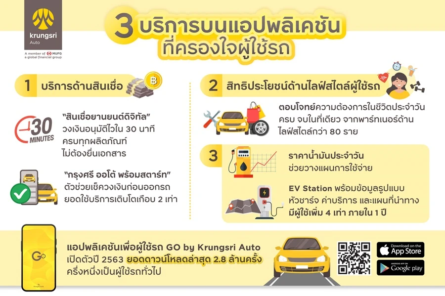 กรุงศรี ออโต้ ผู้นำธุรกิจสินเชื่อยานยนต์ครบวงจร เครือธนาคารกรุงศรีอยุธยา จำกัด (มหาชน) เล็งเห็นถึงเทรนด์วัฒนธรรมการบริโภคที่เน้นประสบการณ์มากกว่าเน้นการขาย (Experience Economy) และพฤติกรรมผู้บริโภครุ่นใหม่ที่ใช้ชีวิตบนโลกออนไลน์มากขึ้น (New Generation of Digital Consumers) จึงได้เก็บรวบรวมข้อมูลอินไซต์ของผู้ใช้รถ มุ่งมั่นพัฒนาแอปพลิเคชันเพื่อผู้ใช้รถ GO by Krungsri Auto ซึ่งเปิดตัวมาตั้งแต่ปี 2563 และล่าสุดมียอดดาวน์โหลดกว่า 2.8 ล้านครั้ง ครึ่งหนึ่งเป็นผู้ใช้รถทั่วไปที่ไม่ได้จำกัดเพียงลูกค้าที่มาใช้บริการสินเชื่อ จากเทรนด์และอินไซต์ความต้องการจริงของผู้ใช้แอปพลิเคชันนี้ ทำให้พบว่าในปัจจุบัน มี 3 บริการที่ผู้ใช้รถต้องการมากที่สุดบนแอปพลิเคชัน ได้แก่